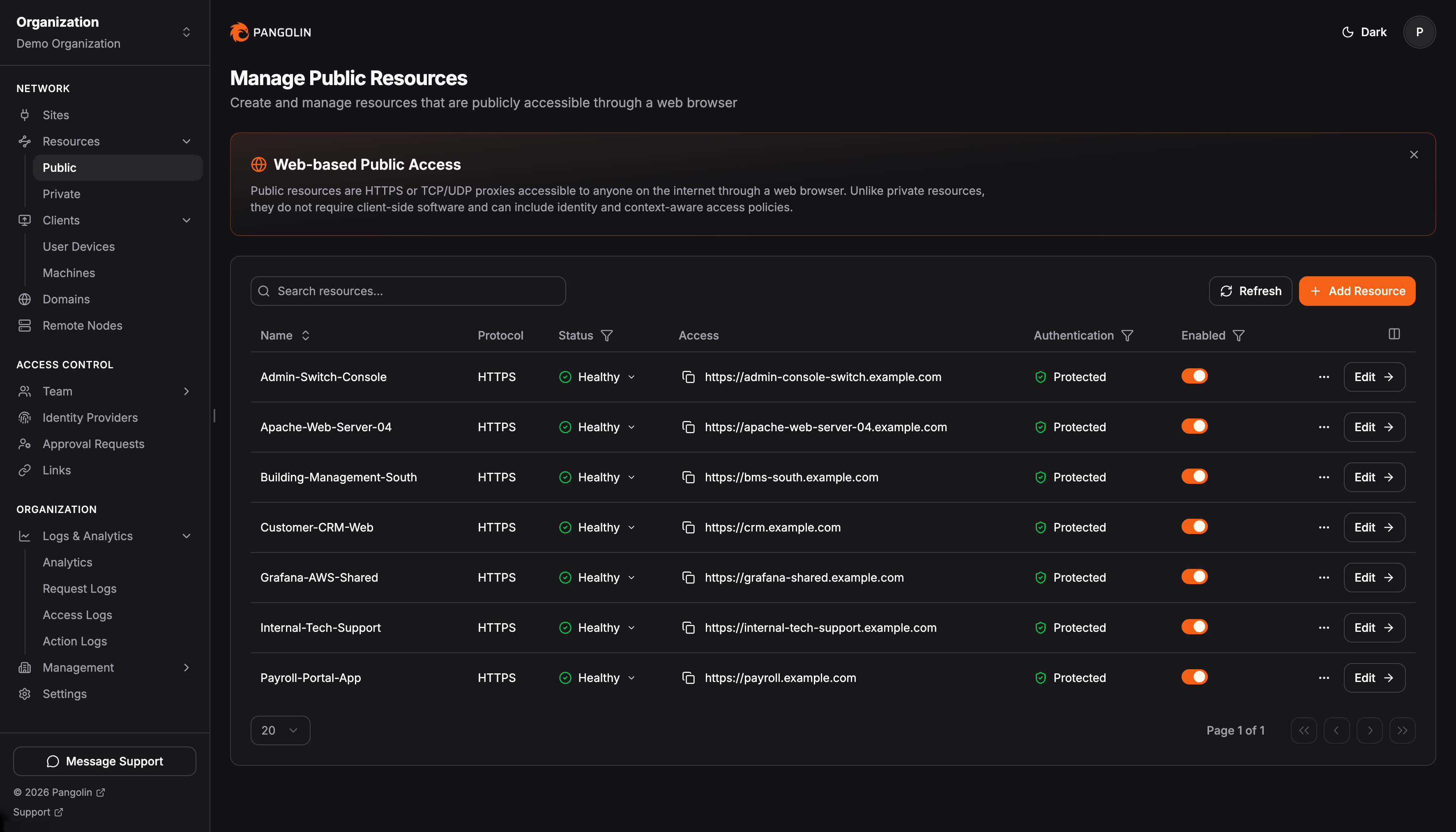 Pangolin is an open-source, identity-based remote access platform built on WireGuard that enables secure, seamless connectivity to private and public resources. Pangolin combines reverse proxy and VPN capabilities into one platform, providing browser-based access to web applications and client-based access to any private resources, all with zero-trust security and granular access control.