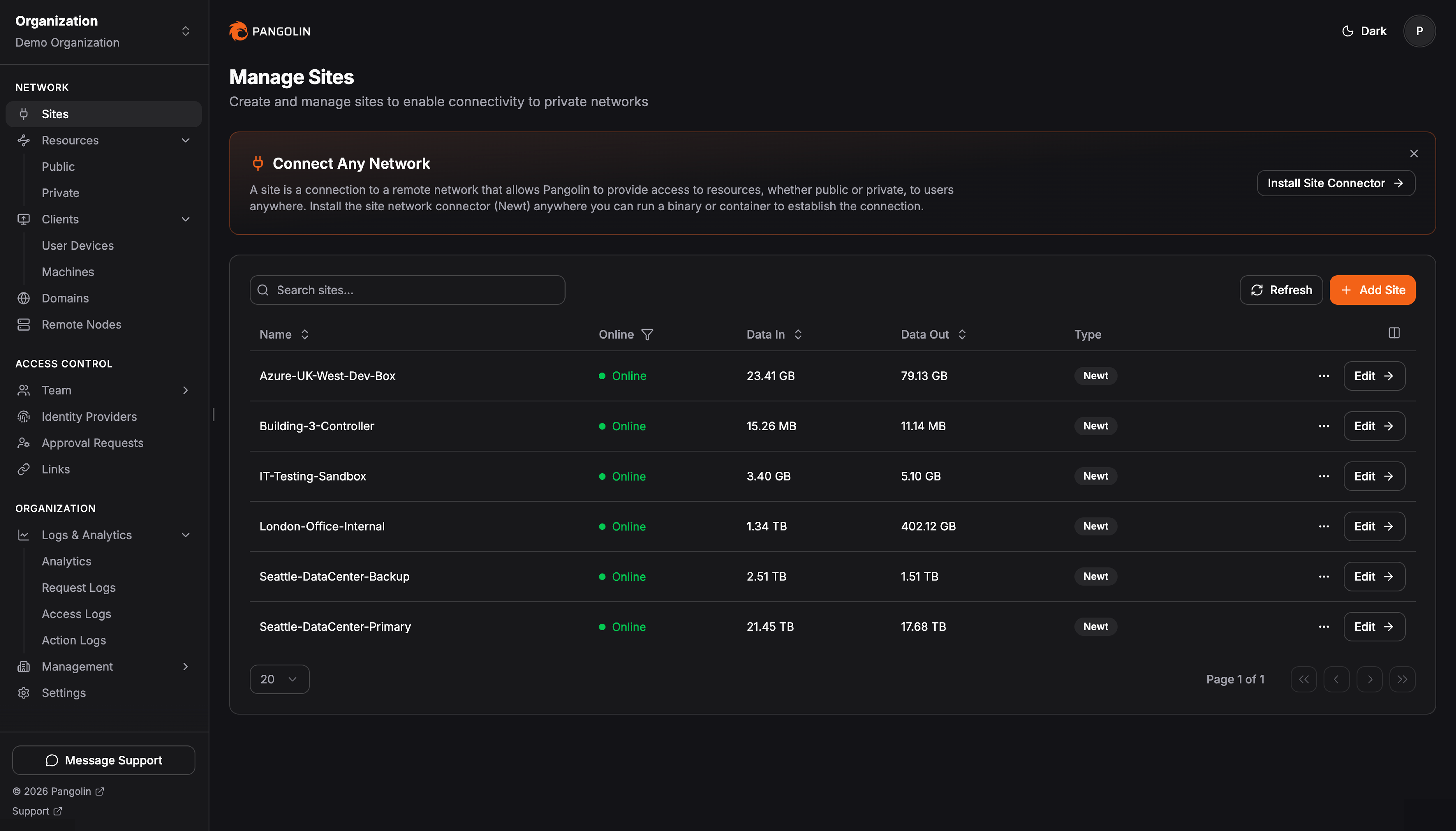 | Connect remote networks with sites Pangolin's lightweight site connectors create secure tunnels from remote networks without requiring public IP addresses or open ports. Sites make any network anywhere available for authorized access. | ![]() |